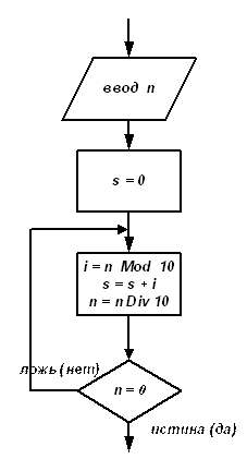 End Repeat Begin End. Repeat Begin ПОВТОРЯТЬ s = s + i; i = i + 1; ДО (i > 100); Программа: Program Gauss; Uses CRT; Var i, s: Word; ClrScr; s:= 0; i:= 1; s:= s + i; i:= i + 1; Until (i>100); WriteLn(‘s = ‘, s); ReadLn; 2. вычислить сумму s всех цифр заданного натурального числа n Пусть s – искомая сумма, i – очередная цифра числа. Тогда алгоритм решения задачи можно описать следующим образом: a. обнуляем сумму s, b. берем последнюю цифру числа, для чего определяем остаток от деления исходного числа на 10: i = n Mod 10, c. добавляем в сумму найденную цифру: s = s + i, d. уменьшаем число в 10 раз: n = n Div 10, e. повторяем цикл до тех пор, пока n = 0 – это и будет условием выхода из цикла. Схема алгоритма: Программа: