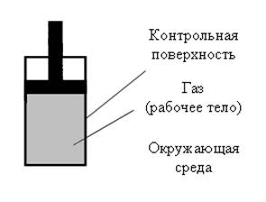 Термодинамическая система представляет собой совокупность материальных тел, находящихся в механическом и тепловом взаимодействиях друг с другом и с окружающей систему внешними телами. Тела не входящие в систему, называют окружающей средой. Систему отделяют от окружающей среды контрольной поверхностью (оболочкой). Пример простейшей системы (ДВС, рис. 1.1) – газ, заключенный в цилиндре под поршнем, внешней средой является окружающий воздух, контрольной поверхностью служат стенки цилиндра и поршень. Механическая работа в данном примере производится при перемещении поршня и сопровождается изменением объема. Тепловое взаимодействие заключается в переходе теплоты между отдельными телами системы и между системой и окружающей средой.