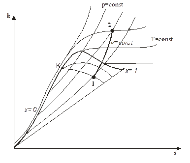 Нагреванием при постоянном объеме влажный пар можно перевести в сухой насыщенный и перегретый. Охлаждением его можно сконденсировать, но не до конца, так как при каком угодно низком давлении над жидкостью всегда находится некоторое количество насыщенного пара. Соответственно изохора не пересекает нижнюю пограничную кривую. На p,v -диаграмме изохорный процесс изображается отрезком прямой, параллельной оси ординат. На T,s -диаграмме процесс изображается кривой линией. В области влажного пара изохора направлена выпуклостью вверх, а в области перегретого пара – вниз. На h,s -диаграмме изохора изображается кривой, направленной выпуклостью вниз.