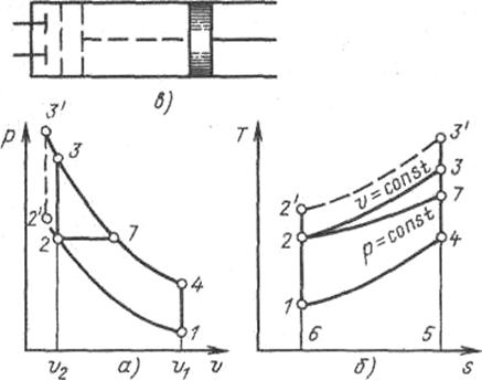Циклы поршневых двигателей внутреннего Чтобы исключить эксергетические потери за счет неравновесного теплообмена с горячим источником теплоты, целесообразно использовать в качестве рабочего тела газы, получающиеся при сгорании топлива. Это удается осуществить в двигателе внутреннего сгорания (ДВС), сжигая топливо непосредственно в его цилиндрах. Теоретический цикл ДВС состоит из адиабатного сжатия 1-2 рабочего тела в цилиндре, изохорного 2-3 или изобарного 2-7 подвода теплоты, адиабатного расширения 3-4 или 7-4 и изохорного отвода теплоты 4-1 (рис. 1.35).