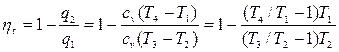 Степень сжатия является основным параметром, определяющим термический КПД цикла. Рассмотрим два цикла с одинаковыми точками 1 и 4, один из которых (1/-2/-3/-4/) имеет большую степень сжатия ε, чем другой (1-2-3-4). Большему значению ε соответствует более высокая температура в конце сжатия 1-2. Следовательно, изохора 2/-3/ расположена в Т, s - диаграмме выше, чем изохора 2-3. Из рис. 1.35 б, видно, что количество теплоты q1, подведенной в цикле 1-2/-3/-4 (площадь 2/-3/-5-6), больше, чем количество теплоты, подведенной в цикле 1-2-3-4 (площадь 2-3-5- 6). Количество отведенной теплоты q2 в обоих циклах одинаково (площадь 4-5-6-1). Следовательно, термический КПД Термический КПД цикла двигателя внутреннего сгорания увеличивается с ростом степени сжатия ε. Нетрудно получить аналитическую зависимость