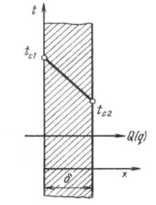 Рис. 2.2. Стационарное распределение температуры по толщине однородной плоской стенки