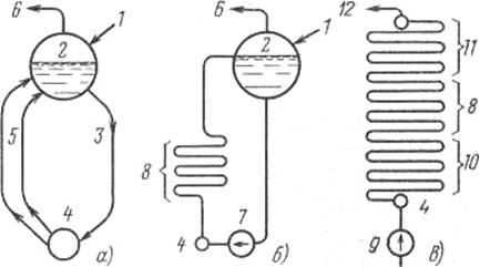 Рис. 3.3. Схемы движения воды, пароводяной смеси и пара в котельном агрегате: а - естественная циркуляция; б - многократно-принудительная циркуляция; в - прямоточное движение; 1 - подвод питательной воды; 2 - барабан; 3 - необогреваемые опускные трубы; 4 - нижний коллектор; 5 - обогреваемые подъемные трубы; 6 - отвод насыщенного пара; 7 - циркуляционный насос; 8 - испарительная поверхность; 9 - питательный насос; 10 - экономайзерная часть поверхности нагрева; 11 - пароперегревательная часть поверхности нагрева; 12 - отвод перегретого пара.
