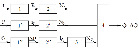 Всякий учета состоит из первичных промежуточных и вторичных преобразователей сигналов, трубной и электрической проводки. Первичный преобразователь производит преобразование температуры, давления или расхода пара в промежуточную величину, которую достаточно легко измерить. Промежуточный измерительный преобразователь измеряет эту величину и преобразует её в цифровой код, который затем вторичным преобразователем преобразуется в размерную переменную. Структура измерительного канала теплоты.
