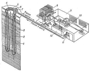 Искусственное замораживание грунтов применяется как способ временного закрепления неустойчивых обводненных грунтов, при строительстве котлованов под фундаменты зданий, практически всех наклонных тоннелей, перегонных тоннелей метрополитена, большинства шахтных стволов, коллекторных и канализационных тоннелей, а также под устройство противофильтрационных завес. Для создания льдогрунтового ограждения (рис. 3) по контуру выработки или котлована бурят скважины, в которые затем опускают замораживающие колонки, а в них — питающие трубы. В колонках циркулирует охлажденный на замораживающей станции рассол (раствор соли хлористого кальция). В процессе непрерывного теплообмена с рассолом грунт, окружающий колонку, охлаждается и замерзает, образуя вокруг колонок льдо-грунтовые цилиндры. Постепенно цилиндры увеличиваются в диаметре и соединяются между собой, превращаясь в сплошное ограждение. По выходе из замораживающих колонок рассол направляют через коллектор на замораживающую станцию, где его снова охлаждают при помощи холодильных машин различной производительности. Различают следующие основные методы Замораживание грунтов: с параллельным или последовательным включением скважин; зональный, локальный (из забоя ствола) и ступенчатый. К новым методам Замораживание грунтов, разработанным в СССР и получающим распространение в практике строительства подземных сооружений, относятся: методы безрассольного и воздушного Замораживание грунтов, способы замораживания в грунтах с проточной водой, метод горизонтального замораживания и др. Наряду с этим освоены: устройство котлованов без крепления с использованием замороженных грунтов в качестве ограждающих конструкций, дифференцированный способ Замораживание грунтов и др.