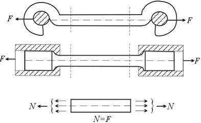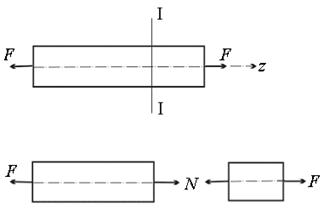 Растяжение (сжатие) – вид нагружения, при котором в поперечных сечениях стержня появляются только нормальные силы, а остальные силовые факторы равны нулю. При этом положительная нормальная сила направлена в сторону внешней нормали к сечению, т.е. вызывает растяжение, а отрицательная – сжатие. Внешние силы в этом случае приводятся к равнодействующей, направленной вдоль оси стержня. Формально растяжение от сжатия отличается только знаком нормальной силы. Ниже будет показано, что это не всегда справедливо. В частности, при растяжении и сжатии могут сильно различаться механизмы разрушения. Кроме того, при сжатии длинных гибких стержней возникает опасность их изгиба, что значительно усложняет методы их расчета (см. раздел “Устойчивость сжатых стержней”). Для нахождения нормальных сил применяется метод сечений – стержень мысленно рассекается плоскостью, перпендикулярной его оси, на две части. Взаимодействие частей стержня заменяется силой N, величина которой определяется из условия равновесия какой-либо из частей: