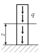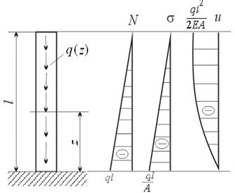 Пример 2.2. Построение эпюр нормальных сил, нормальных напряжений и продольных перемещений в вертикальном стержне. Площадь поперечного сечения A, удельный вес материала γ.