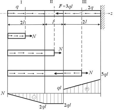 Решение. Стержень разбивается на силовые участки, границами которых служат сечения, где приложены сосредоточенные нагрузки, либо начинается или заканчивается действие распределенных нагрузок. В нашем примере стержень имеет три таких участка. Для нахождения нормальной силы на каждом из участков поочередно мысленно проводится сечение, рассекающее стержень на две части. Записывая условия равновесия для показанных на рисунке отсеченных частей стержня, получаем выражения для нормальной силы на каждом из выделенных участков: