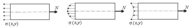 В соответствии с принципом Сен-Венана можно считать, что на некотором удалении от места приложения нагрузки, способ нагружения роли не играет, и нормальная сила определяется только равнодействующей нагрузки. Для большей части растянутого стержня справедлива гипотеза плоских сечений, согласно которой поперечные сечения смещаются параллельно начальному положению, оставаясь плоскими.