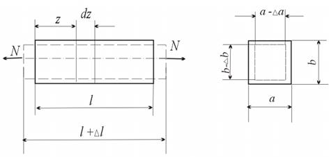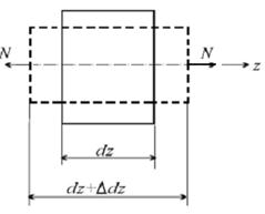 При сжатии соответственно уменьшится длина, и увеличатся поперечные размеры. Рассмотрим элемент стержня длиной dz