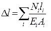 Знаменатель этой формулы Для ступенчатого стержня, нагруженного несколькими сосредоточенными силами, удлинения вычисляются на участках, где сила N и жесткость EA постоянны, а результаты алгебраически суммируются: