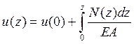 где u (0) – перемещение сечения, расположенного в начале координат. Принимая за начало отсчета неподвижное сечение, перемещение произвольного сечения u (z) можно найти как удлинение части стержня, расположенного между этим сечением и заделкой.