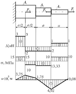 Пример 2.3. Построение эпюр нормальных сил, нормальных напряжений и продольных перемещений в ступенчатом стержне.