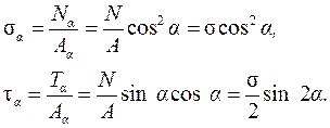 Здесь Анализируя полученные зависимости (2.7), можно сделать несколько выводов: 1) наибольшие нормальные напряжения возникают в поперечных сечениях, где a = 0; cos 2 a = 1; 2) наибольшие касательные напряжения возникают в сечениях, повернутых к оси стержня на 45°, и достигают половины наибольших нормальных; 3) в продольных сечениях ( 4) сумма нормальных напряжений на любых двух взаимно перпендикулярных площадках постоянна и равна s: