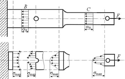 Равномерное распределение напряжений по площади поперечного сечения стержня нарушается не только в окрестности приложения нагрузок, но и вблизи мест резкого изменения формы или площади сечения. Это явление носит название концентрации напряжений, а сами факторы, вызывающие ее – концентраторами напряжений. Концентрация напряжений значительно усложняет картину их распределения по сечению. Однако это усложнение носит местный характер. На рис.2.1 показано распределение напряжений на некотором удалении от концентраторов (сечения B,C) и вблизи них.