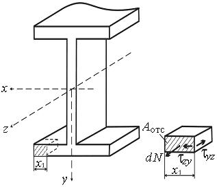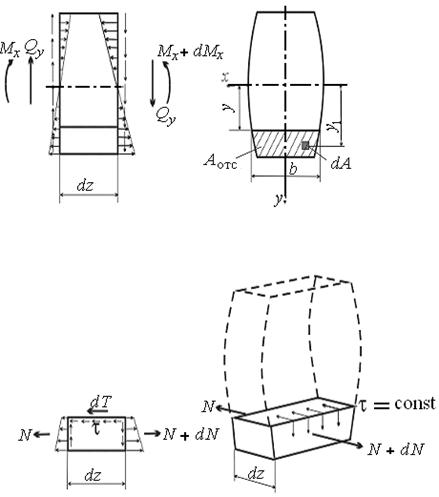 Дополнительно рассечём выделенный элемент горизонтальной плоскостью, проходящей на произвольном расстоянии y от нейтральной оси, и рассмотрим условие равновесия нижней части элемента. Площадь поперечного сечения отсечённой части элемента обозначим A отс, положение элементарной площадки dA определим координатой y1 (рис.9.3. б). Равнодействующая нормальных сил s dA в левом сечении равна