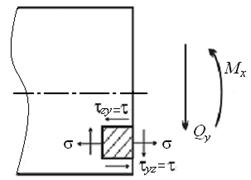 Наличие поперечной силы Qy приводит к появлению в плоскости сечения касательных напряжений τ zy (рис.9.2). По закону парности такие же по величине напряжения действуют в продольных сечениях: