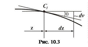 В точке С 1 к оси изогнутой балки проведена касательная, угол наклона которой к оси z обозначен q. Принимая гипотезу плоских сечений, можно считать, что угол поворота поперечного сечения в этой точке также равен q (см. рис.10.2) Бесконечно малому приращению координаты dz соответствует приращение прогиба dv (рис. 10.3), откуда