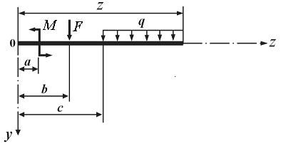 Данный метод был разработан с целью упрощения расчётов при нахождении функций прогибов и углов поворота в балках. Его суть заключается в использовании универсальных уравнений для функций перемещений, содержащих только две постоянные интегрирования, независимо от числа силовых участков. Эти константы представляют собой значения угла поворота и прогиба в начале координат (начальные параметры) и легко находятся из условий закрепления балки. Рассмотрим участок балки, длиной z, нагруженный, как показано на рис. 10.6.