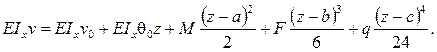 В нижних пределах интегрирования учтено, что нагрузки создают изгибающий момент на участке, лишь начиная с некоторого значения координаты z: момент М – начиная со значения z = а, силы F – с точки её приложения z = b и т.д. Интегрируя по известным правилам без раскрытия скобок, получим