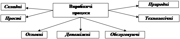 Простим називається процес по виготовленню окремої деталі, звірків або монтажний, що складається з ряду послідовних операцій. Операція – частина виробничого процесу, яка виконується на одному робочому місці без переналагодження устаткування. Складним називається виробничий процес по виготовленню закінченого виробу (вузла), що складається з взаємозалежних простих процесів. Допоміжними є процеси, що створюють умови для нормальної течії основних процесів (ремонт устаткування, вироблення енергії, виготовлення інструменту …)... Обслуговуючими є процеси контролю якості продукції, заготівельно-складські. Технологічними називаються процеси зміни фізичної, хімічної й іншої властивостей оброблюваних предметів праці. Природними називають процеси зміни властивостей предметів праці, які здійснюються без особистої участі людини і спеціальних засобів праці (висихання фарби на повітрі).