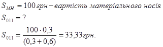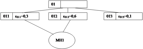 2-й спосіб – експертний метод: шляхом аналізу матеріального носія. 3-й спосіб – пропорційно значимості (чи важливості) кожної функції. Значимість функції показує в умовних одиницях роль чи внесок даної функції в реалізацію функції більш високого рівня. Важливість – роль у реалізації об'єкта в цілому. Приклад: функція 01 реалізується трьома функціями нижчого рангу 011, 012, 013 (рис. 7.4), а матеріальний носій МН1 реалізує дві функцій 011 і 012.