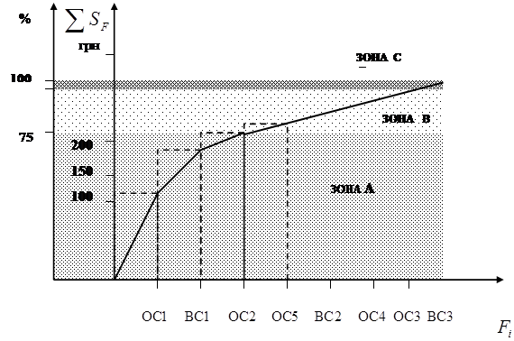 По осі ординат відкладаються витрати наростаючим підсумком. Практика ФВА показала, що насамперед потрібно оптимізувати функції зони А (75% усіх сумарних витрат). Якщо серед цих функцій будуть знайдені резерви для зниження витрат, то інші функції оптимізації не піддаються. Якщо резерви для зниження витрат не знайдені, то потрібно оптимізувати функції зони В (75 - 95% усіх сумарних витрат). Далі - зона С. У розглянутому прикладі (рис. 7.5) потрібно в першу чергу оптимізувати функції ОС1, ВС1, ОС2.