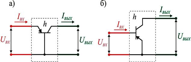 Рис. 5.1– Замена транзистора активным четырехполюсником в схеме с ОБ (а) и в схеме с ОЭ (б)