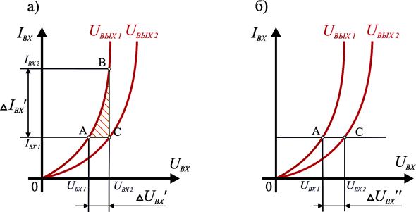 Для определения “h”-параметров по входным характеристикам (рис. 5.2, а) на известных статических характеристиках строится характеристический прямоугольный треугольник, вершины которого находятся на известных характеристиках. От вершин треугольника опускаются перпендикуляры на ось IВХ в масштабе определяется треугольник Δ IВХ и на ось UВХ в масштабе определяется треугольник Δ UВХ.