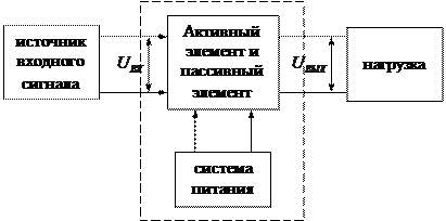 Электронные усилители. Электронным усилителем называют устройство, обеспечивающее увеличение мощности электрических сигналов, поступающих на его вход. Увеличение мощности сигнала в усилителе происходит за счет преобразования энергии источника питания. Это преобразование происходит с помощью активных элементов, которые управляются входными сигналами. Входной сигнал подается через электрическую цепь, которая называется входной или входом усилителя. Электрическая цепь, в которой образуется усиленный сигнал, называется выходной цепью. Для выделения усиленного сигнала в выходную цепь включается нагрузка. Нагрузкой может служить резистор, колебательный контур, обмотка трансформатора, откл. пластины ЭЛТ. Нагрузка, по которой протекает постоянная составляющая выходного тока, называется нагрузкой по постоянному току. Сопротивление цепи, по которой протекает переменная составляющая выходного тока, образует нагрузку по переменному току. Для разделения нагрузок по переменному и постоянном току применяются разделительные конденсаторы и тр-ры. Простейший усилитель содержит один активный элемент с присоединенным к нему пассивными элементами.