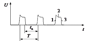 Кратковременное изменение токов и напряжения от некоторого уровня называют электрическими импульсами. Они определяют форму импульсов: прямоугольную, треугольную колоннообразную, пилообразную ступенчатою и др. Такие импульсы называются видеоимпульсами. В импульсных устройствах чаще всего применяются прямоугольные видеоимпульсы. Они характеризуются фронтом 1, вершиной 2 и спадом или срезом 3.