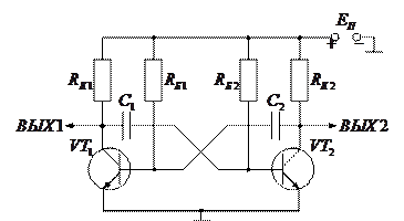 Мультивибраторы. Мультивибраторы применяются, когда нет жестких требований вырабатываемых импульсов длительности и частоты повторения. Схема простейшего мультивибратора на дискретных элементах имеет вид: