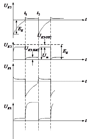 Графики изменений коллекторных и базовых напряжений мультивибратора будут иметь вид: (рис.)