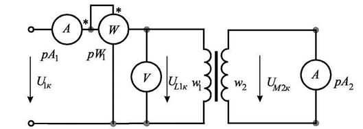 Значение этой мощности определяется по показаниям ваттметра рW1 (рис.43). I1к и I2к - токи в опыте короткого замыкания соответствующих обмоток трансформатора, определяемые по показаниям амперметров рА1 и рА2.