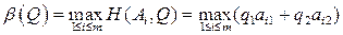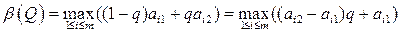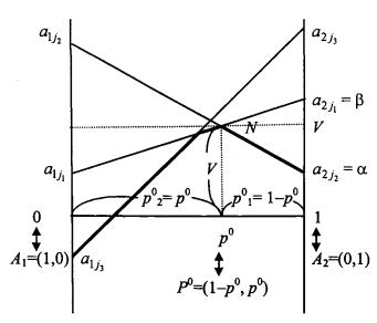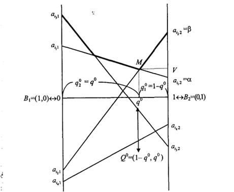 6. Если все отрезки 7. Если все отрезки 8. Если отрезок 9. Находим (выделяем) нижнюю огибающую (10.1) семейства отрезков (10.3), которая в общем случае будет представлять собой выпуклую вверх ломаную, а, в частности, может быть и отрезком. 10. На нижней огибающей находим максимальную (наивысшую) точку (или точки). 11. Абсцисса 12. Ордината наивысшей точки нижней огибающей является ценой игры V (см. 10.2)). 13. Верхний из двух концов нижней огибающей (лежащих на перпендикулярах) есть нижняя цена игры в чистых стратегиях 14. Нижний из верхних концов отрезков 15. Элемент матрицы А, изображающая точка которого является нижней на перпендикуляре, где она лежит, и верхним концом отрезка, на котором она лежит, будет седловой точкой игры. В этом случае чистая стратегия игрока В, номер которой совпадает со вторым индексом седловой точки, является оптимальной.