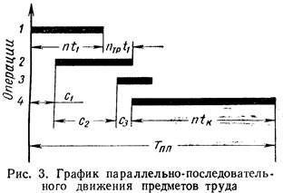 Необходимость выравнивания (синхронизации) длительности отдельных операций существенно ограничивает возможность широкого применения параллельного вида движения, что способствует применению третьего – параллельно-последовательного вида движения предметов труда. Параллельно-последовательный вид движения предметов труда характеризуется тем, что процесс обработки деталей (сборки машин) данной партии (серии) на каждой последующей операции начинается раньше чем полностью заканчивается обработка всей партии деталей (сборки машин) на каждой предыдущей операции. Детали передаются с одной операции на другую частями, транспортными (передаточными) партиями. Накопление некоторого количества деталей на предыдущих операциях перед началом обработки натрии на последующих операциях (производственный задел) позволяет избежать возникновения простоев. Параллельно-последовательный вид движения предметов труда позволяет значительно уменьшить продолжительность производственного процесса обработки (сборки) по сравнению с последовательным видом движения. Применение параллельно-последовательного вида движения экономически целесообразно в случаях изготовления трудоемких деталей, когда длительности операций процесса значительно колеблются, а также в случаях изготовления малотрудоемких деталей крупными партиями (например, нормалей мелких унифицированных деталей и т. д.). При параллельно-последовательном виде движения предметов труда могут быть три случая сочетания длительности операций: 1) предыдущая и последующая операции имеют одинаковую длительность (t1 = t2); 2) длительность предыдущей операции t2 больше длительности последующей t3, т. е. t2 > t3; 3) длительность предыдущей операции t3 меньше длительности последующей t4, т. е. t3 < t4. В первом случае передача деталей с операции на операцию может быть организована поштучно; из соображения удобства транспортировки может быть применена одновременная передача нескольких деталей (передаточной партией). Во втором случае последующая, менее продолжительная операция может быть начата только после окончания обработки всех деталей на предыдущей операции, входящих в первую передаточную партию. На рис. 3 это имеет моего при переходе от первой операции ко второй. В третьем случае (на рис. 3 – переход от 3 к 4-й операции) нет необходимости накапливать детали на предыдущей операции. Достаточно передать одну деталь на последующую операцию и начать ее обработку без всякого опасения возможности возникновения простоя. В этом, как и в первом случае, передаточная партия устанавливается только из транспортных соображений. Момент начала работы на каждой следующей операции (рабочем месте) определяется по графику или путем расчета минимальных смещений с. Минимальное смещение с2 определяется разностью между длительностями предыдущей большей t2 и последующей меньшей операциями t3, а именно: с2 = n * t2 – (n – nтр) * t3, где nтр – величина передаточной (транспортной) партии, которая для второго случая сочетания длительности операций определяется из соотношения с1 / t1 (с1 – минимальное смещение первой операции), во всех остальных случаях – из условий удобства транспортировки.