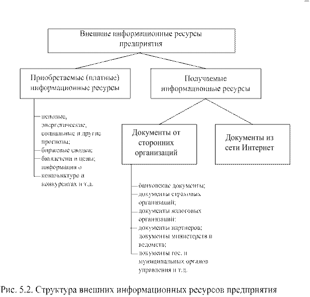 Внешние информационные ресурсы могут быть как платными (приобретаемыми), так и предоставляемыми сторонними организациями в соответствии с договоренностями или обязательствами (получаемые ресурсы). Некоторые документы данного класса представлены на рис. 5.2. Как те, так и другие могут иметь как бумажную форму представления, так и передаваться по каналам связи. Внешние информационные ресурсы возникают во внешней среде и отражают экономические, социальные, рыночные, технологические, банковские, налоговые, страховые и другие отношения, в которых находится предприятия с иными хозяйствующими субъектами. Форма существования таких информационных ресурсов – это web-сайты, электронные документы, документальные Внешние приобретаемые информационные ресурсы включают периодически выполняемые платные услуги аналитического характера. Например, в различных консалтинговых фирмах можно заказать анализ динамики курса валют, кросс-курсы валют, динамики ценных бумаг, ставок привлекаемых рублевых и других депозитов, информацию о конкурентах, тенденциях в изменениях в деловой среде и состоянии международных рынков и т.д. В отличие от приобретаемых, получаемые информационные ресурсы отражают деловые и другие отношения со сторонними, выше или ниже стоящими организациями. Содержательно информационные ресурсы данного класса отражают информацию, получаемую из банков, страховых, налоговых и прочих организаций. Особое место в данном классе занимают Интернет-ресурсы отдельных министерств и ведомств. Собственные информационные ресурсы могут быть либо структурированными, и тогда они подлежат арифметической, логической и другой обработке программными средствами, либо нет, что не позволяет осуществлять с ними подобных операций. Структурируемые информационные ресурсы – это базы данных, хранилища данных, базы знаний и т д.