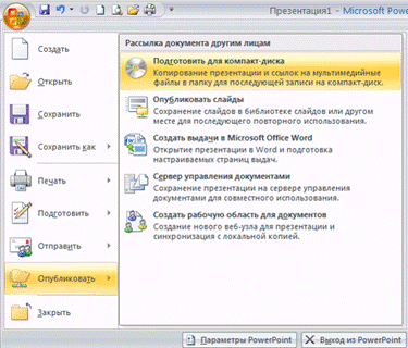 Обратите внимание на расширение звукового файла. Если файл имеет расширение *.wav, то такой файл будет встроен в тело презентации. Максимальный объем такого файла до 50 мб. Как настроить объем встраиваемого файла? Звук, встроенный с таким расширением, без особых проблем будет воспроизведен на другом компьютере. Недостаток этого формата связан с тем, что звуковые файлы имеют большой объём. Для того чтобы перенести презентацию, содержащую звуковой файл, на другой компьютер или переслать по электронной почте: - Нужно скопировать файлы в ту папку, где находится презентация, они будут доступны для приложения Microsoft Office PowerPoint 2007, и приложение PowerPoint сможет обнаружить файлы, когда их потребуется воспроизвести.(Довольно часто потом необходимо будет вручную обновить все ссылки путем удаления звуковых файлов и повторного их добавления.) - Если перемещать файлы с помощью средства «Подготовить для компакт-диска», ссылки на них будут обновляться автоматически. Кнопка Microsoft Office -пункт Опубликовать-команда Подготовить для компакт-диска.