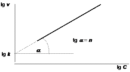 В соответствии с вышеизложенным порядок простой необратимой реакции может быть определён такими способами: 1) Интегральные методы. 1.1) По константам скорости. Процедура состоит в измерении концентрации реагента (или реагентов) в различные моменты времени и в подстановке полученных данных в уравнения для расчёта константы скорости реакции первого и второго порядка, выведенные ранее (а при необходимости и в уравнение для третьего порядка). То уравнение, которое для различных интервалов времени даёт значения константы скорости, характеризующиеся наименьшим разбросом значений, следует считать наиболее правильно отражающим порядок реакции. Если вычисления ни по одному из этих уравнений не дают удовлетворительных результатов (значения константы скорости во всех случаях имеют значительный разброс), то считается, что реакция имеет дробный порядок. В том случае, когда концентрация исходных веществ линейно уменьшатся с течением времени, принимается, что реакция имеет нулевой порядок. 1.2) По времени полупревращения. Метод аналогичен предыдущему, с тем различием, что в этом случае рассчитываются не k, а величины t 1/2. 1.3) Графический. По экспериментальным данным строятся графики зависимостей для первого порядка ln C - t (см. рис. 12.2), для второго порядка 1/ C - t (см. рис. 12.3), при необходимости для нулевого порядка C - t и для третьего порядка 1/ C 2 - t. Тот график, на котором точки лучше всего укладываются на прямую линию, соответствует порядку реакции. 2) Дифференциальный метод (по Вант-Гоффу, 1884) Уравнение закона действующих масс для исследуемой реакции можно приблизительно записать в виде v = kCn, где n - суммарный порядок реакции. Логарифмируя это выражение, получим уравнение прямой, не проходящей через начало координат: lg v = lg k + n lg C. Построив по экспериментальным данным график зависимости логарифма скорости исследуемой реакции от логарифма концентрации одного из исходных веществ (рис. 12.4), можно определить её порядок как тангенс угла наклона графика к оси абсцисс. При этом от оси ординат отсекается отрезок, равный логарифму константы скорости реакции.