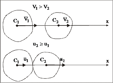 Определение: Удар двух АТТ, при котором общая нормаль к поверхностям АТТ в точке их соприкосновения проходит через их центры масс и скорости центров масс АТТ в начале удара направлены по этой общей нормали, называется прямым центральным ударом. Рассмотрим прямой центральный удар двух поступательно движущихся АТТ с массами m1 и m2. Обозначим скорости центров масс этих соударяющихся АТТ в начале удара через Если второе АТТ находится впереди первого и