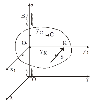 Из второго и третьего уравнений (8.23) следует, что для отсутствия ударных реактивных импульсов необходимо, чтобы приложенный ударный импульс был направлен параллельно оси Оx, то есть перпендикулярно плоскости yОz, которая проходит через ось вращения и центр масс АТТ (рис. 53).