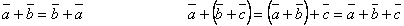 В математике все вектора являются свободными, их можно переносить параллельно самим себе. В сумме двух векторов (рис.1, а) начало второго вектора можно поместить в конец первого вектора, тогда сумму двух векторов можно представить как вектор, имеющий начало в начале первого вектора, а конец в конце второго вектора. Применяя это правило для суммы нескольких векторов (рис.1, б) получаем, что суммой нескольких векторов является вектор замыкающий ломаную линию, состоящую из слагаемых векторов. Операции над векторами подчиняются следующим законам (см. рис.2):