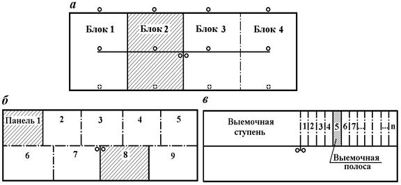 Блок (рис. 1.8, а) - это часть шахтного поля, вскрытие которой осуществляется самостоятельными вскрывающими выработками стволами и квершлагами или только стволами (при горизонтальном залегании пластов) и имеющая, как правило, обособленное проветривание. Границами блока являются: по простиранию - границы соседних блоков или же с одной стороны граница шахтного поля, по падению - границы выемочного горизонта. Блоки по простиранию объединяются общим для всего горизонта магистральным штреком, по которому производится транспортирование угля к главному стволу. В свою очередь блок может разделяться на: этажи, панели, выемочные полосы. Размеры блока по простиранию 2000-4000 м.