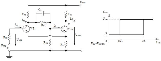 Это несимметричный триггер. Связь транзисторов VT1 и VT2 происходит посредством формирующей цепи Rб1C1. ПОС образована резистором Rэ. 1. Uупр=0; транзистор VT2 в насыщении, на его базу поступает питание от Uпит через Rк1 и Rб1. На Rэ – падение напряжения Iэ2Rэ=URэ, которое обеспечивает запирание транзистора VT1. Конденсатор С1 заряжен Uс1=Iб2Rб1. 2. Uупр>Uбэ10+Iэ2Rэ, где Uбэ10 – пороговое (откр.напр.), транзистор VT1 открывается. Напряжение Uс1 – смещает эмиттерный переход транзистора VT2 в обратном направлении, следовательно транзистор VT2 – запирается. Увеличение тока коллектора транзистора VT1 может быть только за счет уменьшения тока коллектора транзистора VT2 (закон сохранения энергии). Т.к. Rк1 > Rк2, схема имеет гистерезис. Эта схема более устойчива к любой даже емкостной нагрузке. Схема также имеет название – Шмидта. Может использоваться как пороговое устройство для сравнения двух напряжений.