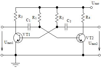 тогда амплитуда выходного сигнала стремится к бесконечности, независимо от того какой была максимальная амплитуда входного сигнала, тогда в схеме возможно существование устойчивых колебаний. Мнимая часть уходит Условие (1) выполняется, если выполняется 1. А условие (1) называется баланс амплитуд Если эти условия верны только для одной частоты – то имеем автогенератор гармонических колебаний. Автогенераторы могут быть: 1. Низкочастотные– fa<100 кГц 2. Высокочастотные– 100 кГц< fa < 10 МГц 3. Ультравысокочастотные fa>10 МГц Условие баланса амплитуд обеспечивает усилительный элемент– биполярный транзистор, полевой транзистор, операционный усилитель; баланс фаз– конденсатор – фазосдвигающая цепь. Как самый распространенный автогенератор рассмотрим – мультивибратор Перевод – воспринимает много гармоник. Рассмотрим схему: