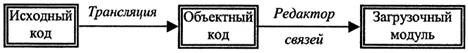 Процесс создания программы включает: - создание исходного кода программы на языке программирования, - этап трансляции, необходимый для создания объектного кода программы, - построение загрузочного модуля готового к использованию. Все перечисленные действия требуют специальных программных средств. Процесс создания программы графически можно изобразить следующим образом: