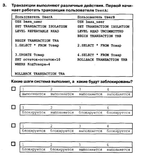 Указать вариант ответа. После завершения транзакции в таблице Товар останутся товары с названиями: · названия: 'а', 'д', 'е' · названия: 'а', 'd', ' с', 'е' · названия: 'a’, 'b', 'с', 'е', 'f · названия: 'а', 'b', 'd', 'е' 2. Дана таблица Товар. На начало транзакций в таблице записей нет: BEGIN TRAN A INSERT Товар (КодТовара, Название, остаток) VALUES (1, 'V, 40) BEGIN TRAN В INSERT Товар (КодТовара, Название, остаток) VALUES (2, 'n', 50) BEGIN TRAN С INSERT Товар (КодТовара, Название, остаток) VALUES (3, 'm', 60)
