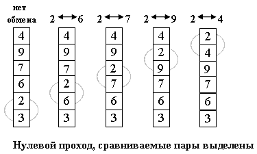 Принцип метода: Расположим массив сверху вниз, от нулевого элемента - к последнему. Идея метода: шаг сортировки состоит в проходе снизу вверх по массиву. По пути просматриваются пары соседних элементов. Если элементы некоторой пары находятся в неправильном порядке, то меняем их местами.