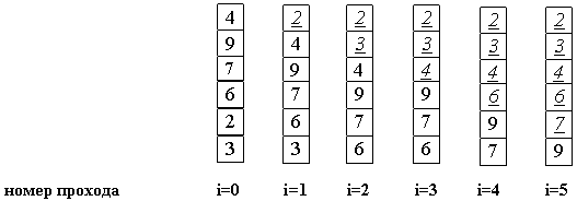 После нулевого прохода по массиву "вверху" оказывается самый "легкий" элемент - отсюда аналогия с пузырьком. Следующий проход делается до второго сверху элемента, таким образом второй по величине элемент поднимается на правильную позицию... Делаем проходы по все уменьшающейся нижней части массива до тех пор, пока в ней не останется только один элемент. На этом сортировка заканчивается, так как последовательность упорядочена по возрастанию.
