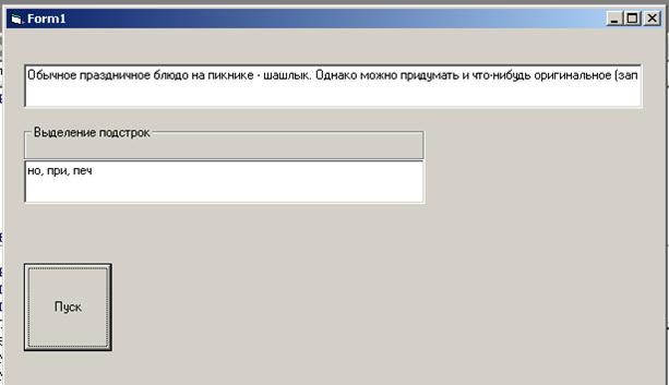 При вызове функций Left() и Right ()нужно указать исходную строку и количество выбираемых из нее символов. Синтаксис операторов, в которых используются функции Left () и Right (), выглядит следующим образом. Результат = Left$ (ИсходнаяСтрока, Числ о Символов) Результат = Right$(Исходная Строка, Числ о Символов) При вызове данных функций значение параметра Числ о Символов должно быть больше нуля. Если оно равно нулю, возвращается строка нулевой длины. Если значение описываемого параметра больше длины исходной строки, возвращается вся исходная строка целиком. Для выделения символов из произвольной части исходной строки используется функция Mid (). Принцип ее применения практически такой же, как и функций Left () и Right (), но за одним исключением. У функции Mid() предусмотрен еще один дополнительный параметр, с помощью которого вы можете выделить одну букву, слово или целое предложение из любой части исходной строки. Функция Mid () имеет два обязательных аргумента и один дополнительный. Ее синтаксис выглядит следующим образом: Результат = Mid(ИсходнаяСтрока, НачальнаяПозиция [, ЧислоСимволов]) В параметре НачальнаяПозиция указывается номер символа в исходной строке, с которого будет начинаться новая строка. Если значение данного параметра превосходит длину строки, возвращается строка нулевой длины. С помощью дополнительного параметра ЧислоСимволов указывается количество символов, которые нужно извлечь из исходной строки. Если данный параметр опущен, возвращается часть строки, начиная с указанной позиции и до конца строки. Ниже приведены несколько примеров использования функции Mid (). print Mid("Александр Пушкин", 11) ' Возвращается "Пушкин" print Mid("Александр Пушкин", 11, 2) ' Возвращается "Пу" Пример: Выделить в строке 2-3 слова, являющиеся подстрокой этой строки Private Sub Command2_Click() Dim S1 As String Dim S As String Text1.Text = "Обычное праздничное блюдо на пикнике - шашлык. Однако можно придумать и что-нибудь оригинальное (запечённую в углях рыбу или мясо, жаренную на вертеле индейку)." S = Text1 N1 = Mid(S, 5, 2) N2 = Mid(S, 61, 3) N3 = Mid(S, 100, 3) Text2.Text = N1 + ", " + N2 + ", " + N3 End Sub